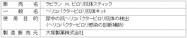 本キットは、抗ヘリコバクターピロリ抗体の検出に基づくヘリコバクターピロリ感染の診断補助を目的とした体外診断用医薬品です。大塚製薬は、尿中抗ヘリコバクターピロリ抗体を迅速かつ簡便に検出できるキット「ラピランH.ピロリ抗体」を開発し、2000年7月に発売しています。発売から10年が経過し、臨床現場からは、現行のキットより、さらに操作性に優れた新たなキットの登場が期待されていました。