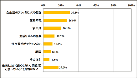 - 子どもの生活習慣で改善したいことのベスト3は「食生活のアンバランスや偏食」「運動不足」「寝不足」。