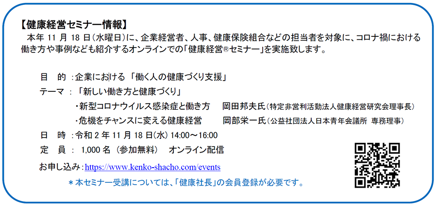 また、これに合わせ、本年11月18日(水曜日)に、企業経営者、人事、健康保険組合などの担当者を対象に、オンラインによる「健康経営®セミナー」を実施致します。