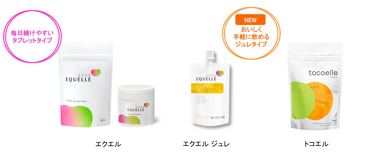 女性の健康と美容を応援するブランド、「エクエル」「トコエル」をあわせて、「エルシリーズ」とよび、ライフステージごとに心身に様々な変化が訪れる女性に寄り添う製品として提供しています。当社は1996年より「女性の健康」をテーマに研究を重ね、大豆イソフラボンが腸内細菌によって代謝されてできる成分"エクオール"こそが、健康と美容、ゆらぎ期®特有の変化に貢献することを明らかにしました。その後も安全性の確認を続け、大豆を乳酸菌で発酵させたエクオール含有食品として「エクエル」(タブレットタイプ)を、2014年に発売。さらに幅広いシーンでおいしく手軽に摂取いただけるよう「エクエル ジュレ」を2018年より展開。2021年には、月経前の女性の変化をやさしくサポートする「トコエル」を発売しました。