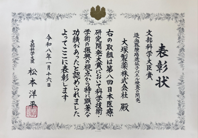 大塚製薬株式会社(本社:東京都、代表取締役社長:井上 眞、以下「大塚製薬」)と国立研究開発法人国立がん研究センター研究所(所在地:東京都、以下「国立がん研究センター」) 分子腫瘍学分野 分野長ならびに慶應義塾大学医学部(所在地:東京都、以下「慶應義塾大学」)内科学教室(血液)教授の片岡圭亮氏は、「造血器腫瘍遺伝子パネル検査の開発」に関し、第8回日本医療研究開発大賞にて文部科学大臣賞を受賞しましたので、お知らせします。1月16日に首相官邸で行われた表彰式において、賞状及び記念楯が授与されました。