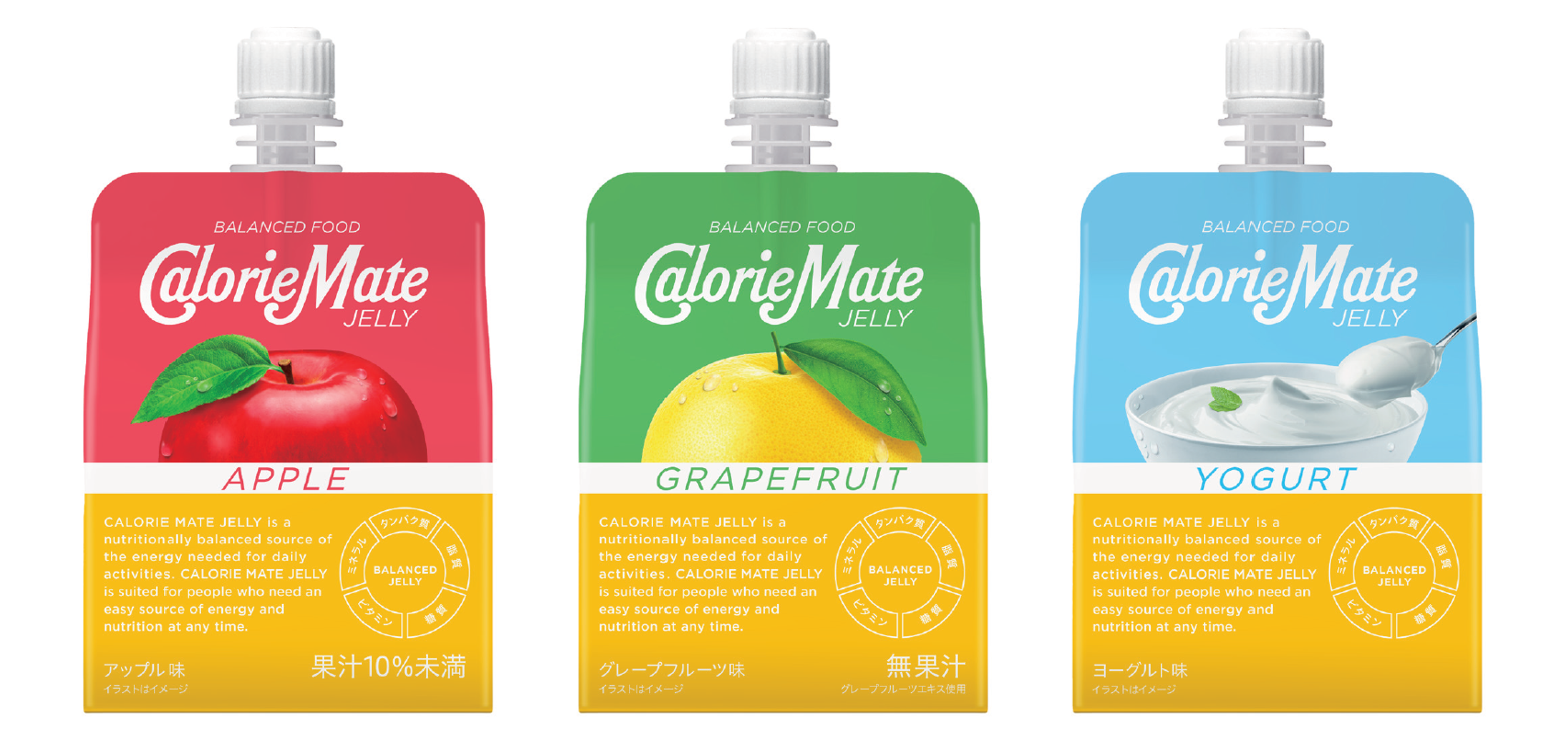 5大栄養素をバランスよく含むすっきり飲みやすいゼリーという特長はそのままに、より美味しさを追求しました。すりおろしりんごのような自然な甘みとやさしい口当たりが人気の「アップル味」に加え、新フレーバーとして爽やかな酸味と深みのある「グレープフルーツ味」と、程よい甘みと爽やかな後味が魅力の「ヨーグルト味」をラインアップ。また、それぞれの味わいのイメージが一目で分かる新デザインのパッケージに生まれ変わることで、"身近なバランス栄養食"として日々の食生活に取り入れていただくことを目指します。