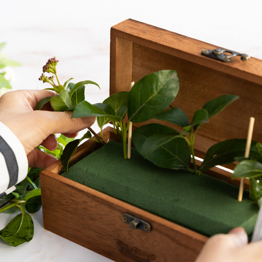 1 箱にぴったり合うようなプラスチック製の容器(ラップやセロハンでもOK)をセットし、中に水を吸わせたフローラルフォームを入れる。フローラルフォームは箱よりも少し高めにカットし、側面を斜めに切り取り、花を挿す面積を増やしておく。フローラルフォームに竹串を2本差し、箱のふたが半分ほど開いた状態にする。