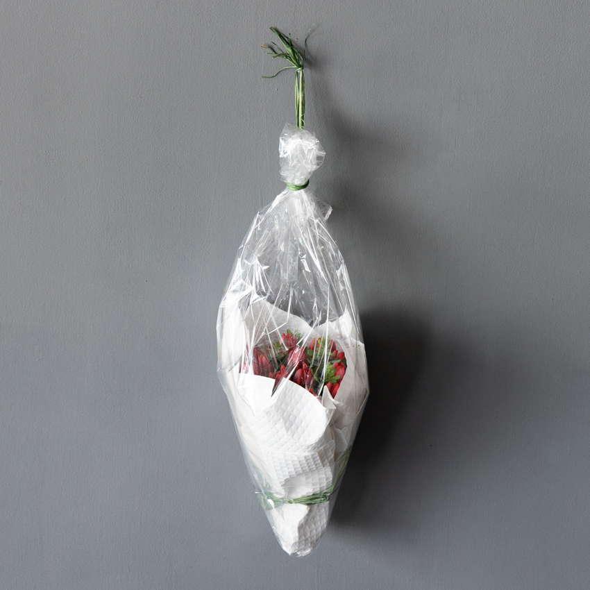 ブーケはスパイラルに束ねます。スパイラルとは、上から見たときに螺旋状に見える束ね方で、崩れにくいのでそのまま花瓶に美しく生けられます。第24回(バレンタインは友人にチューリップのブーケを)でも束ね方を紹介しましたので、そちらも参考にしてください。今回は、ラッピングがポイント。全体をセロハンで包んで上側に持ち手を作るのですが、ブーケを立てたまま手首や腕にひっかけて持ち歩けるので、雪道を歩かなければいけないフィンランド人に重宝されるラッピング方法なんです。贈り先のドアノブにかけておけば、花も傷まないし、嬉しいサプライズギフトになりますね。