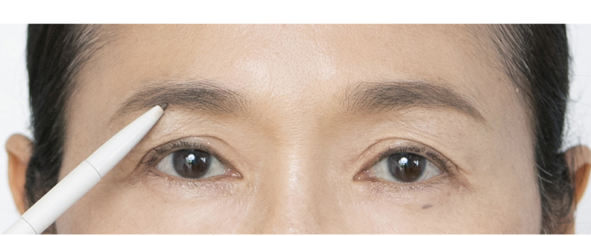 ペンシルで眉の下側のラインや、左右を見比べて足りない部分をペンシルで補正する。つんつんとつつくように描くとよい。