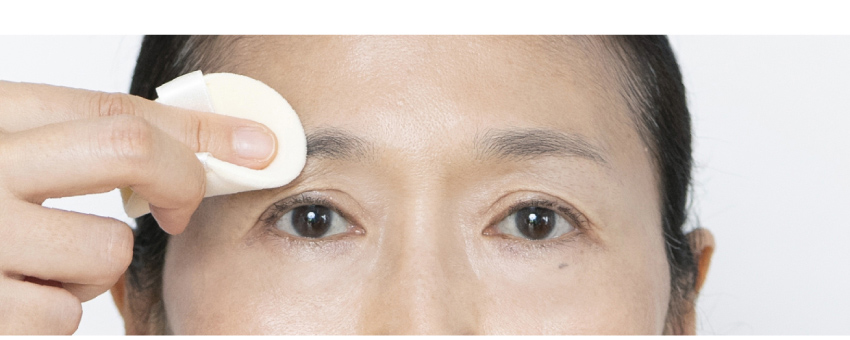 では、まず、大きく深呼吸をしましょう。リラックスして眉メイクを始めると、柔らかい表情に仕上がりますよ。肩の力が抜けたら、フェイスパウダーを眉全体につけてください。このひと手間で眉の油分が取れてきれいに描けます。描いている間も呼吸は止めないでくださいね。「シュッシュ」などと言いながら描くといいと思います。