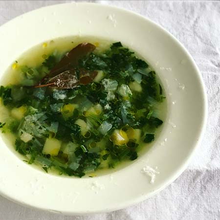 ゆで汁で作るスープ。オリーブ油をたらし、チーズを削るとイタリアみが増しておいしい。