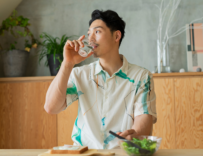 夜は外食で、ついつい高カロリーな食事。でも、携帯しやすいスティックタイプだから、ディナーのテーブルでも気兼ねなし。お冷に溶かして、ゆっくり食事を。