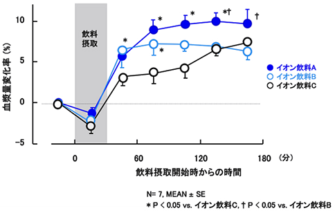 飲料摂取後の血漿量変化率は、イオン飲料Aおよびイオン飲料Bで、飲料摂取開始75分目までイオン飲料Cに比べて有意に高値であった。また、イオン飲料Aは、135分目にイオン飲料Bおよびイオン飲料Cに、また165分目にイオン飲料Cに比べて有意に高値であった。腎でのナトリウム再吸収率は、イオン飲料Aで、飲料摂取開始15~105分目までイオン飲料Cに比べて有意に高値であった。また、イオン飲料Bで45、75分目にイオン飲料Cに比べて有意に高値であった。